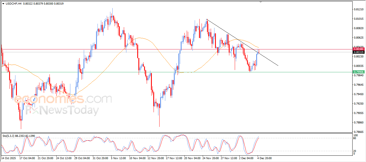 (USDCHF) 가격은 마지막 일중 거래에서 강력한 상승세를 보이며 0.8040 저항선을 다시 테스트했습니다. 이는 가격 변동과 비교했을 때 과도한 매수 과다 수준에 도달했음에도 불구하고 상대 강도 지표에서 긍정적인 신호가 나타난 데 힘입은 것이며, EMA50 저항선에 도달한 것과 더불어 단기적으로 약세 수정 추세선을 테스트하여 이 영역의 강도와 향후 추세를 감지하는 데 있어 중요성을 강화했습니다.