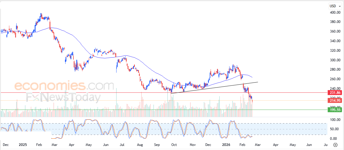 따라서 향후 거래 세션 동안 주가가 232.00달러 저항선 아래에 머무르는 한 하락세를 보이며, 다음 지지선인 195.00달러를 목표로 할 것으로 예상합니다.
