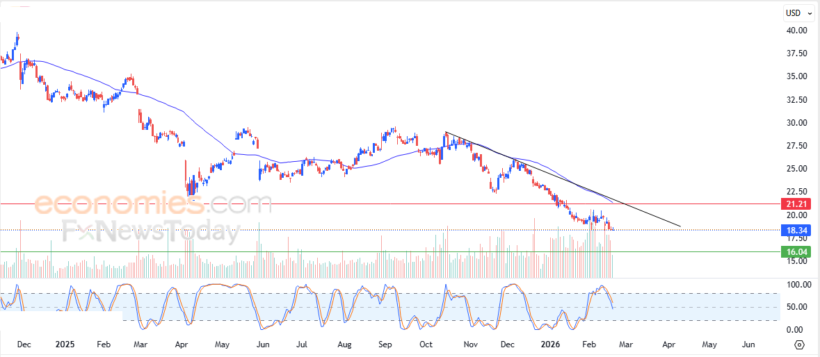 따라서 향후 거래 세션 동안 21.20달러 저항선이 유지되는 한 주가는 하락하여 첫 번째 지지선인 17.00달러를 목표로 할 것으로 예상합니다.