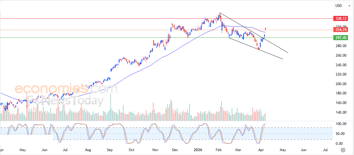 따라서 주가가 297.45달러 지지선 위에서 안정적으로 유지되는 한, 향후 거래 세션 동안 상승할 것으로 예상하며, 형성된 하락 쐐기형 패턴의 목표 가격인 338.00달러의 주요 저항선을 목표로 할 것입니다.