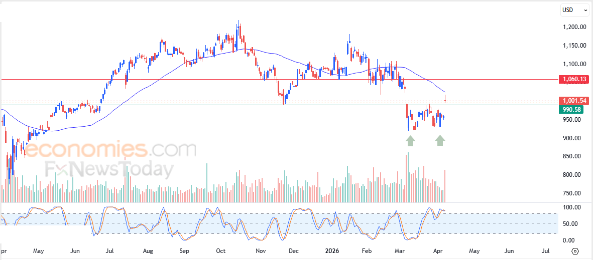 따라서 향후 거래 세션 동안 주가가 상승할 것으로 예상하며, 특히 1,000달러 이상에서 안정적으로 유지되는 한, 형성된 이중 바닥 패턴의 목표 가격인 1,060달러 저항선을 목표로 할 것으로 예상합니다.