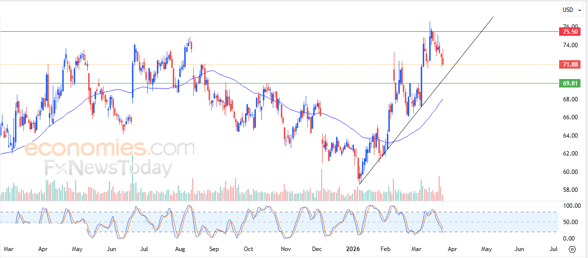 따라서 향후 거래 세션 동안 69.80달러 지지선이 유지되는 한 주가는 상승하여 75.50달러 저항선을 목표로 할 것으로 예상합니다.